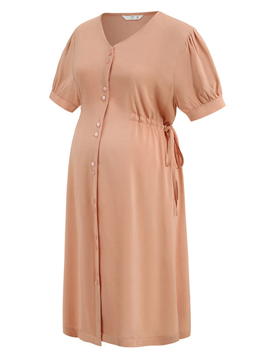 Maternity Drawstring Waist Short Sleeve Button Dress