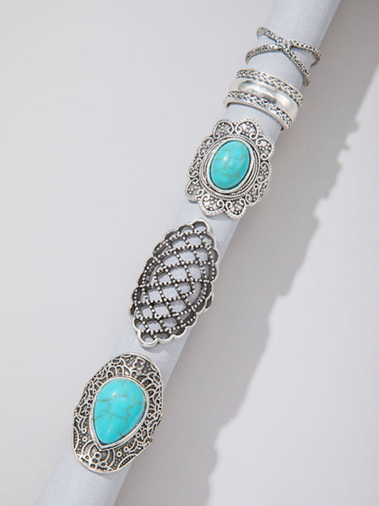 Ethnic style retro inlaid turquoise carved feather ring fashion 8-piece combination ring set