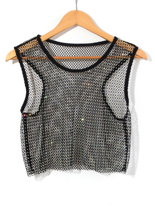 Women's Solid Color Embellished Sheer Fishnet Crop Tank