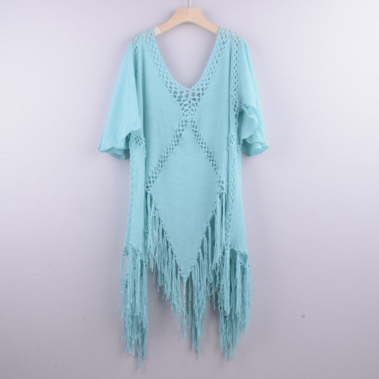 Women's Solid Color Embroidered Cotton Fringe Slit Cover-up Dress
