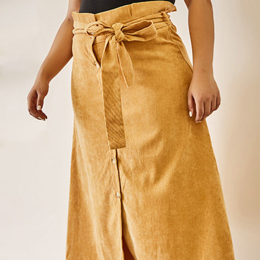 Women's Solid Color Plus Size High Waist Corduroy Belted Midi Skirt