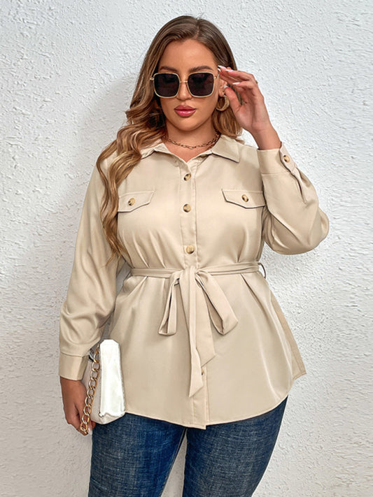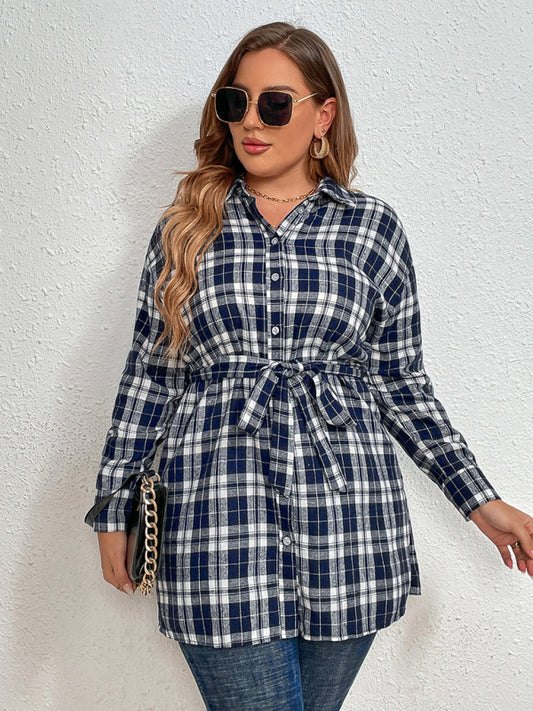 Women’s Plus Size Plaid Pattern Long Sleeve Button Down Waist Tie Longline Shirt