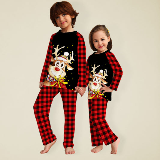 Kid’s Long Sleeves Classic Plaid Print Holiday Reindeer Holiday Fitted Two Piece Pajamas