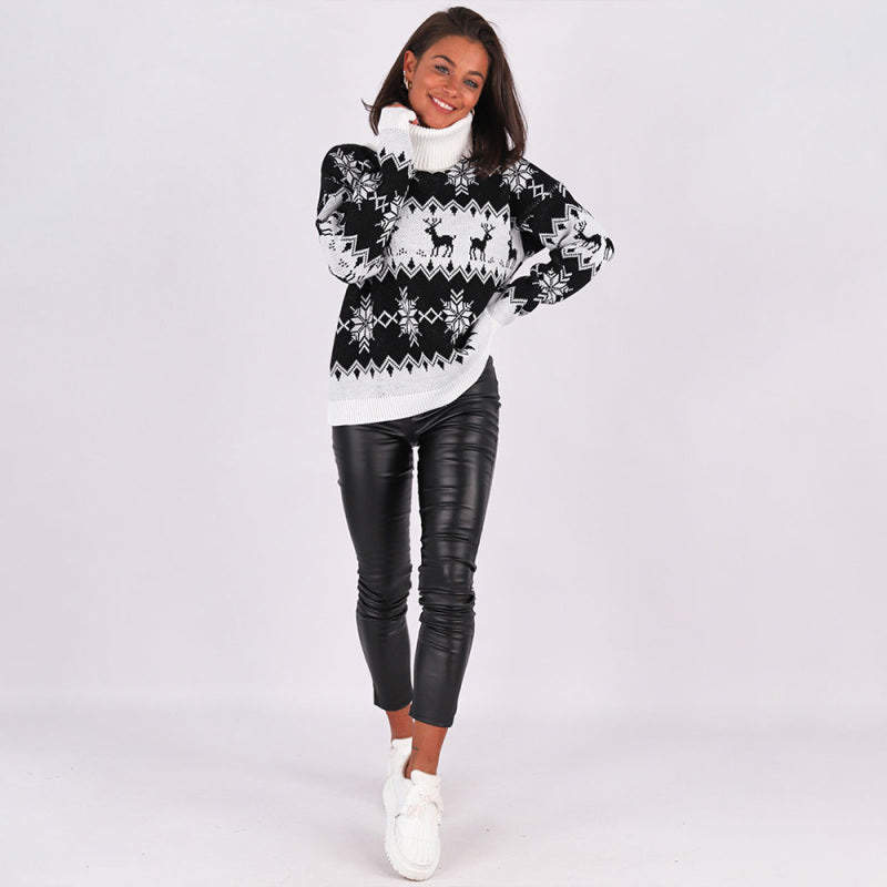 Women’s Stylish Baggy Knit Christmas Sweater With Tall Folded Turtleneck
