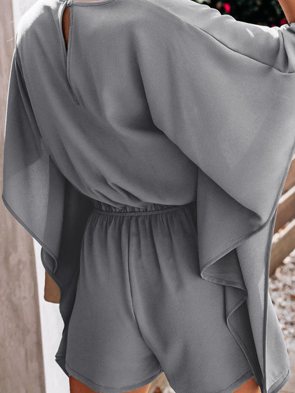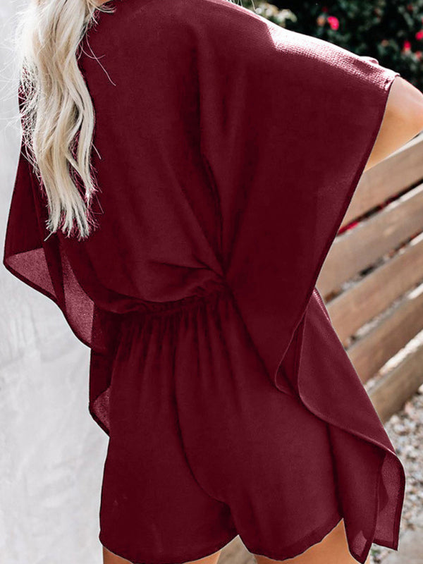 Women's temperament shorts European and American solid color V-neck high waist tie loose jumpsuit