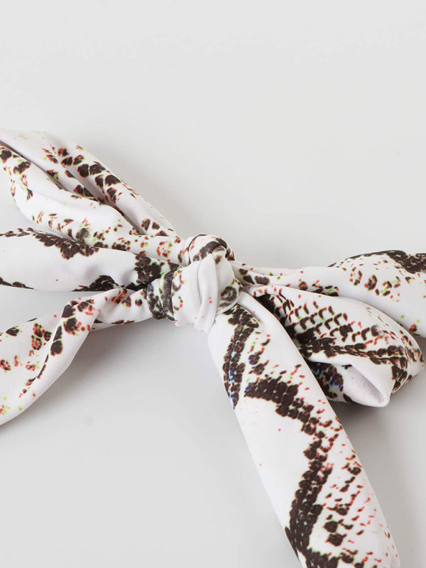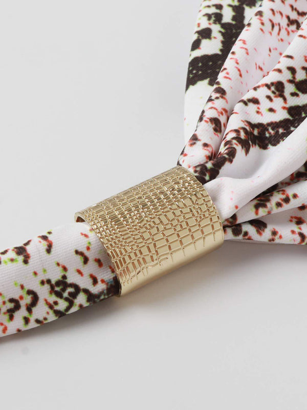 A gold-tone wrap-wire accents a plunging neckline and sleek mix of prints, giving this one-piece swimsuit a look both sophisticated and trendy.