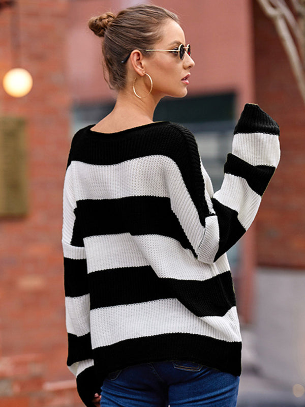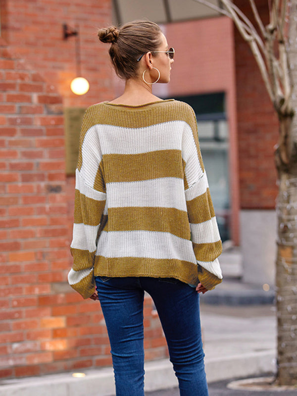Women's rolled round neck striped color block sweater