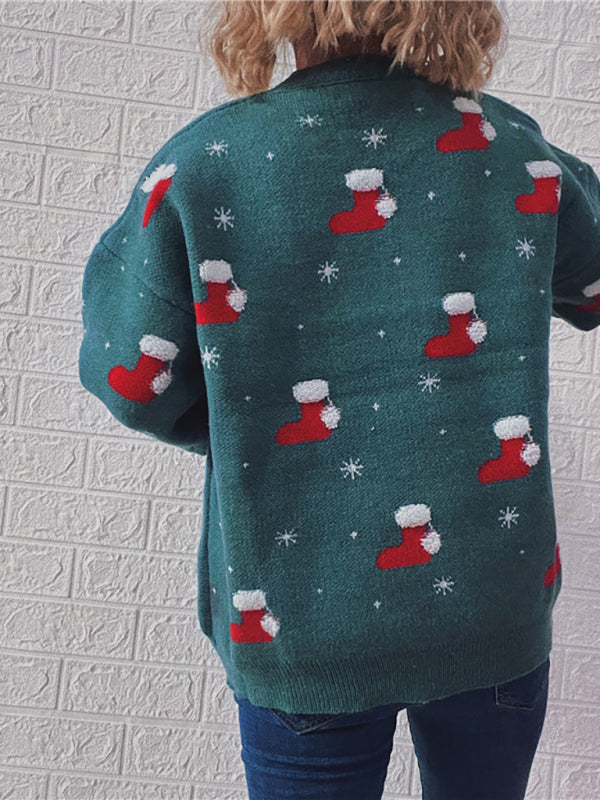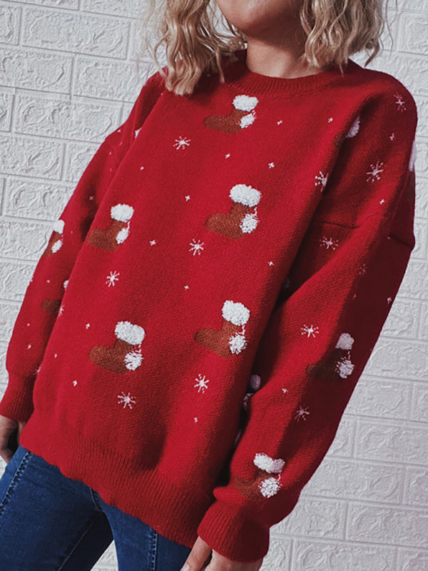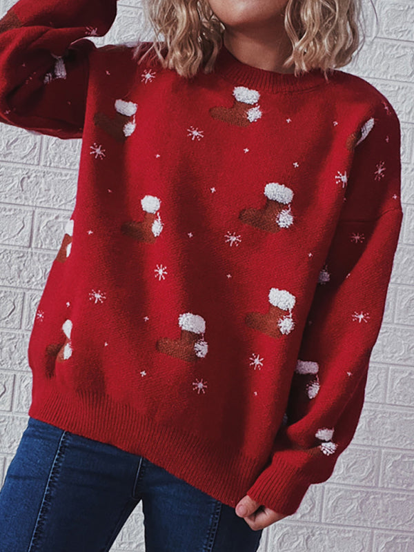 Women's Round Neck Long Sleeve Christmas Sweater Christmas Socks Jacquard Thickened Pullover